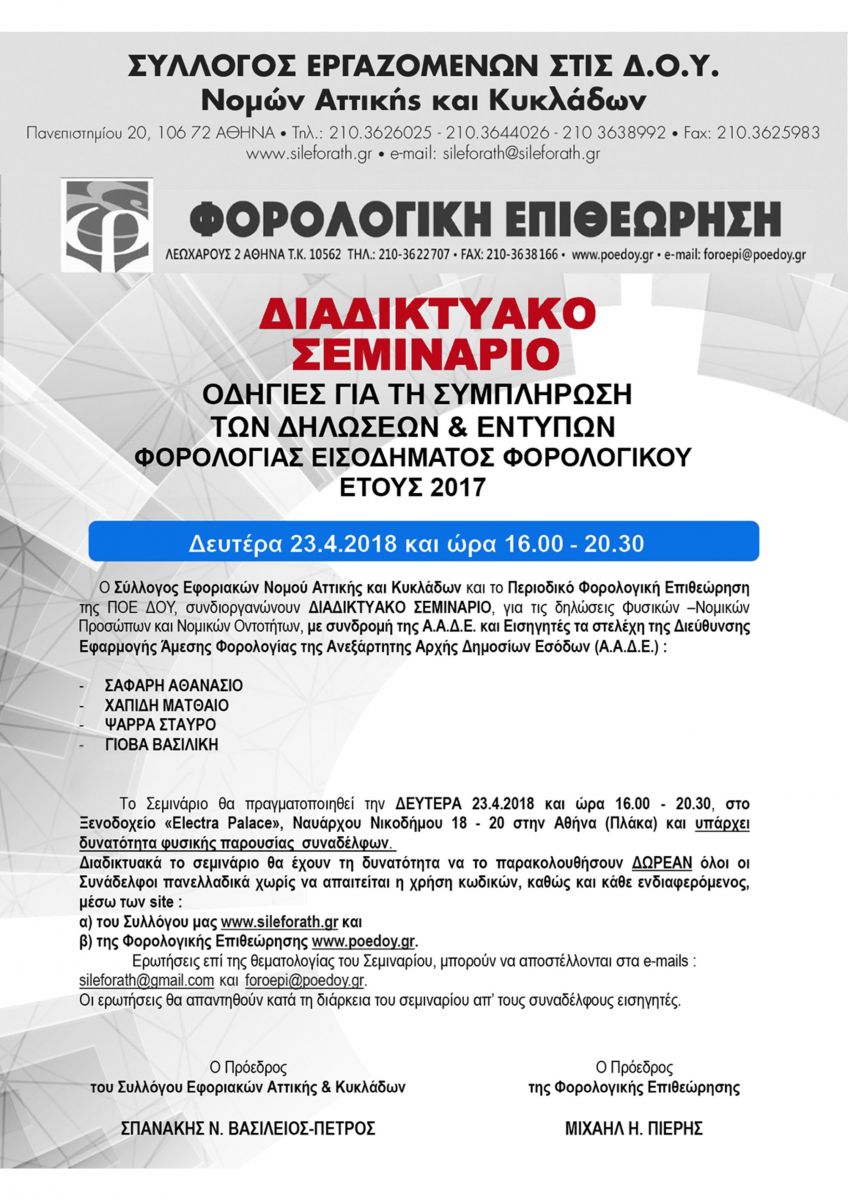 Διαδικτυακό σεμινάριο για τις δηλώσεις φυσικών - νομικών προσώπων και νομικών οντοτήτων συνδιοργανώνουν ο Σύλλογος Εφοριακών Νομών Αττικής και Κυκλάδων και το Περιοδικό Φορολογική Επιθεώρηση της Π.Ο.Ε.-Δ.Ο.Y., με την συνδρομή της Α.Α.Δ.Ε. και Εισηγητές Στελέχη της Διεύθυνσης Εφαρμογής Άμεσης Φορολογίας (Δ.Ε.Α.Φ.) & της Διεύθυνσης Ηλεκτρονικής Διακυβέρνησης (Δ.ΗΛΕ.Δ.) της Ανεξάρτητης Αρχής Δημοσίων Εσόδων (Α.Α.Δ.Ε.).