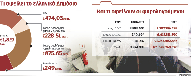 • 3,6 εκατομμύρια Ελληνες χρωστούν μέχρι 10.000 ευρώ και συνολικά 3,7 δισ. ευρώ.
