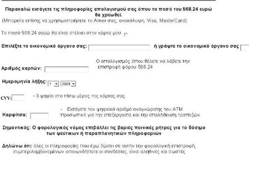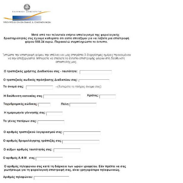 Στο συγκεκριμένο ηλεκτρονικό μήνυμα περιλαμβάνεται το λογότυπο του υπουργείου Οικονομικών και ο παραλήπτης ενημερώνεται ότι δικαιούται κάποιο ποσό ως επιστροφή φόρου, το οποίο για να μπορέσει να το παραλάβει οφείλει να συμπληρώσει προσωπικά του στοιχεία (όπως ονοματεπώνυμο, διεύθυνση κατοικίας, ΑΦΜ, στοιχεία πρόσβασης σε τραπεζικό λογαριασμό, καθώς και στοιχεία πιστωτικής κάρτας) στη φόρμα που υπάρχει.